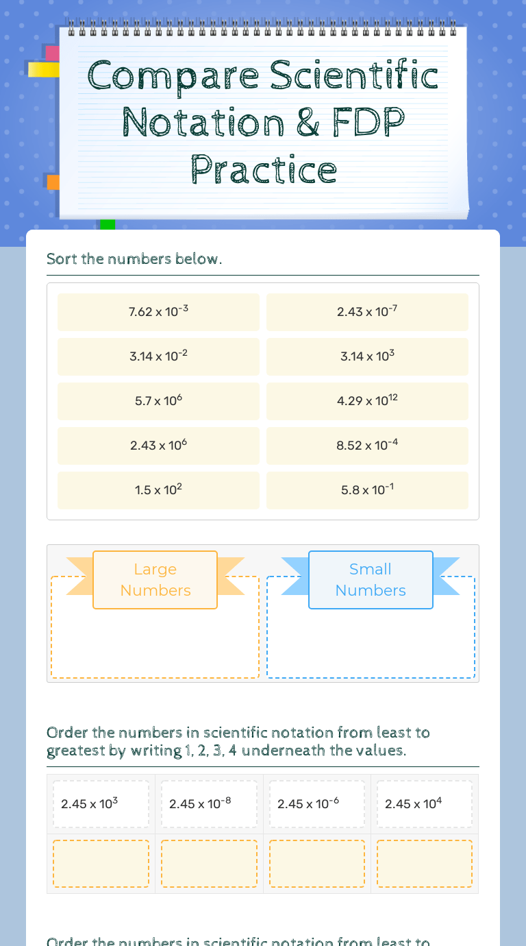 Explore the definition, rules, and examples of scientific notation and learn about the. The worksheet can include problems where you compare fractions with the same denominator, fractions with the same numerator, comparisons to 1/2 or to 1, and so on. Our last figure from the prior example, "0.267 m", would be expressed in the new notation as "0m267". The blue whale weighs approximately 190,000 kilograms, while a plankton weighs just 0.5 milligrams—a difference of 11 orders of magnitude. The numbers are shortened (a number between 1 to 10) and multiplied in the power of 10.